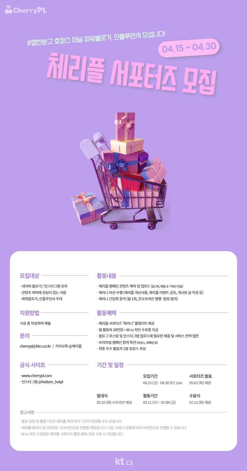 - kt cs 직인 수료증은 체리플 서포터즈 활동 80% 이상 수료 시 지급됩니다.