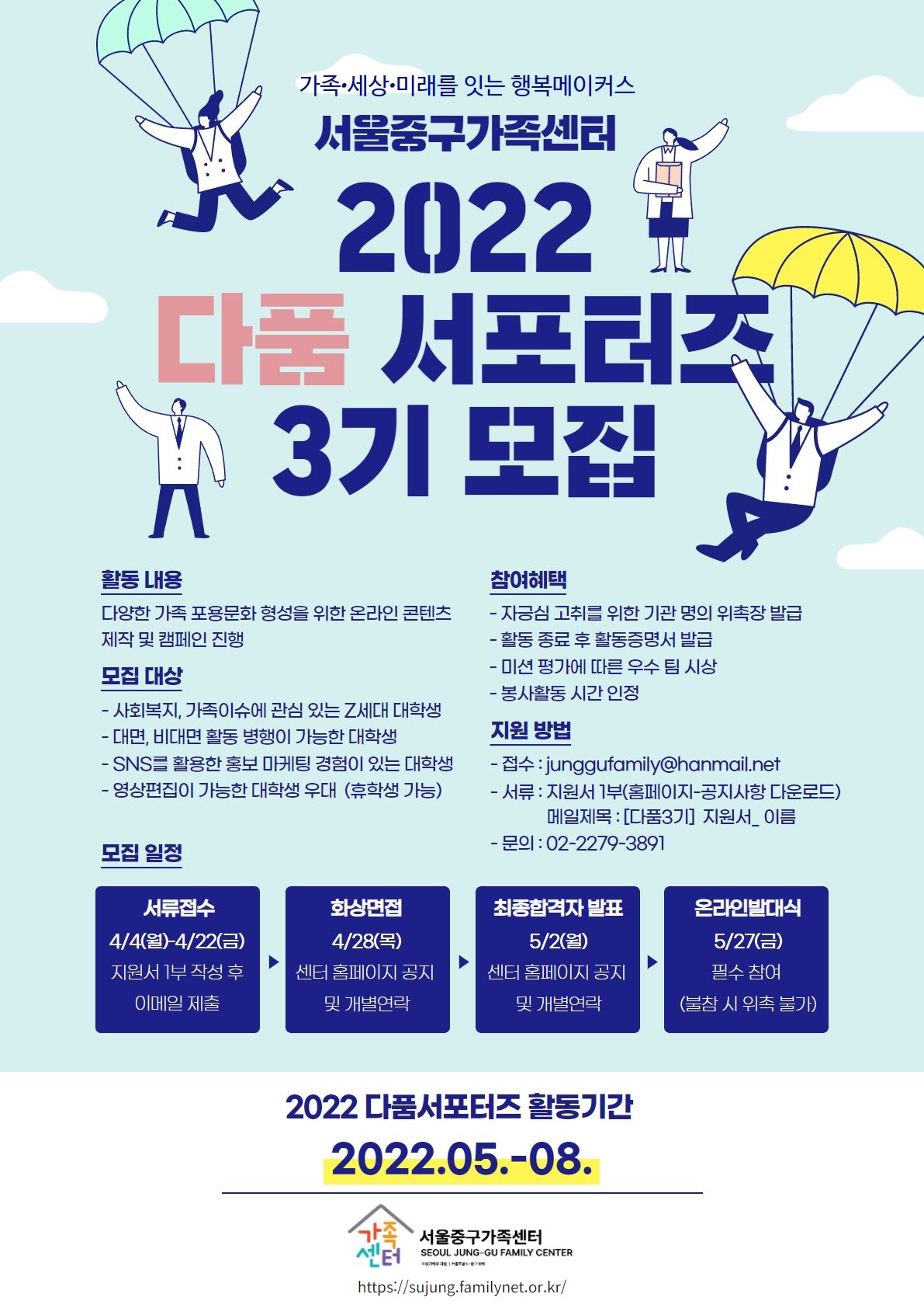 서울중구가족센터에서 2022 다양한 가족 포용 문화 형성을 함께 할 다품 서포터즈 3기를 모집합니다.