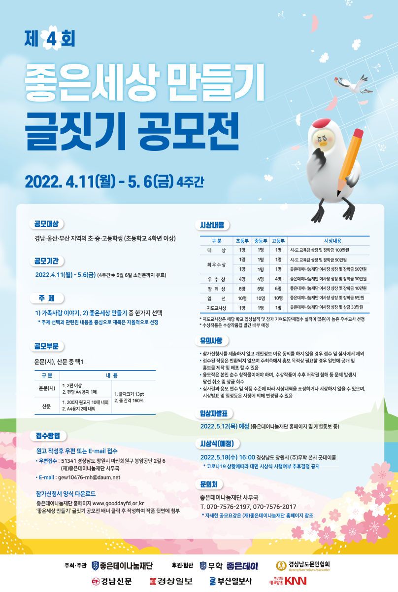 좋은데이나눔재단에서 '좋은세상 만들기' 글짓기 공모전을 주최합니다.