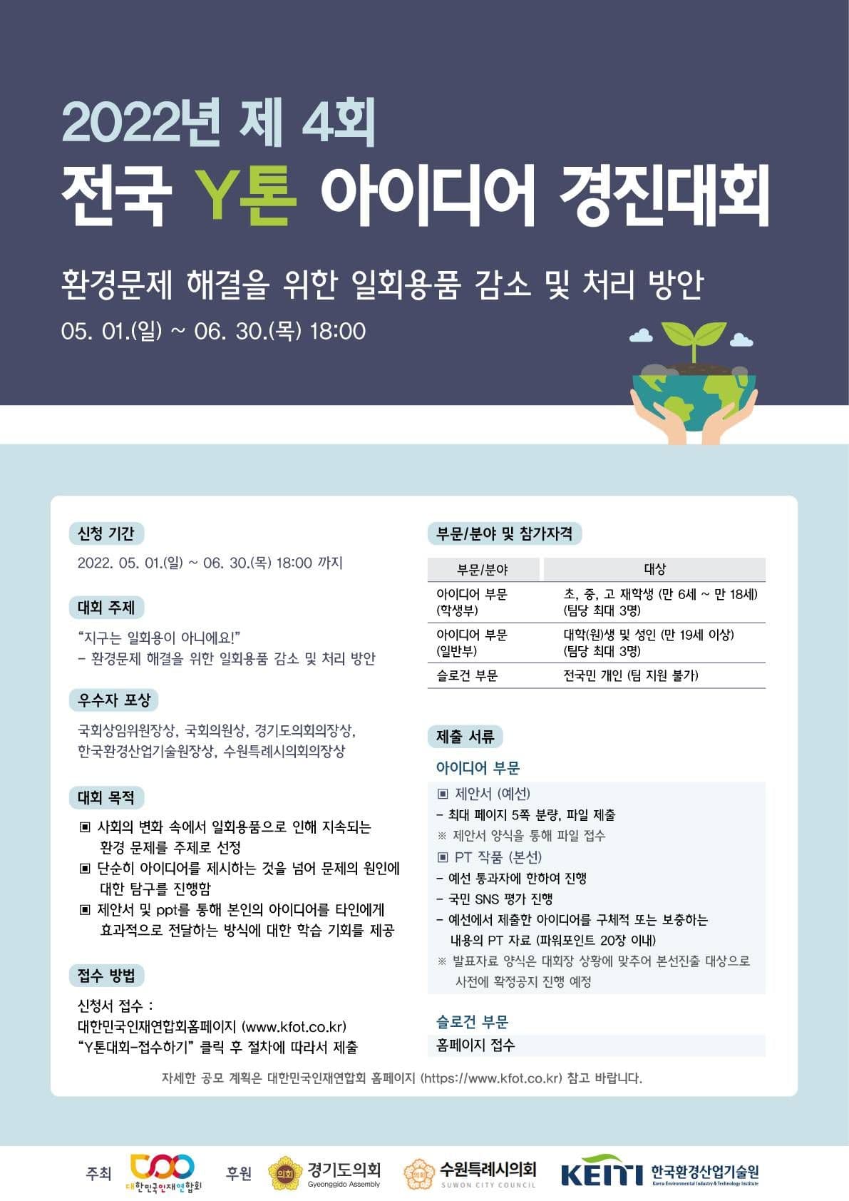대한민국인재연합회/전국Y톤아이디어경진대회 조직위원회가 주최,주관하고 경기도의회, 수원특레시의회, 한국환경산업기술원이 후원하는
