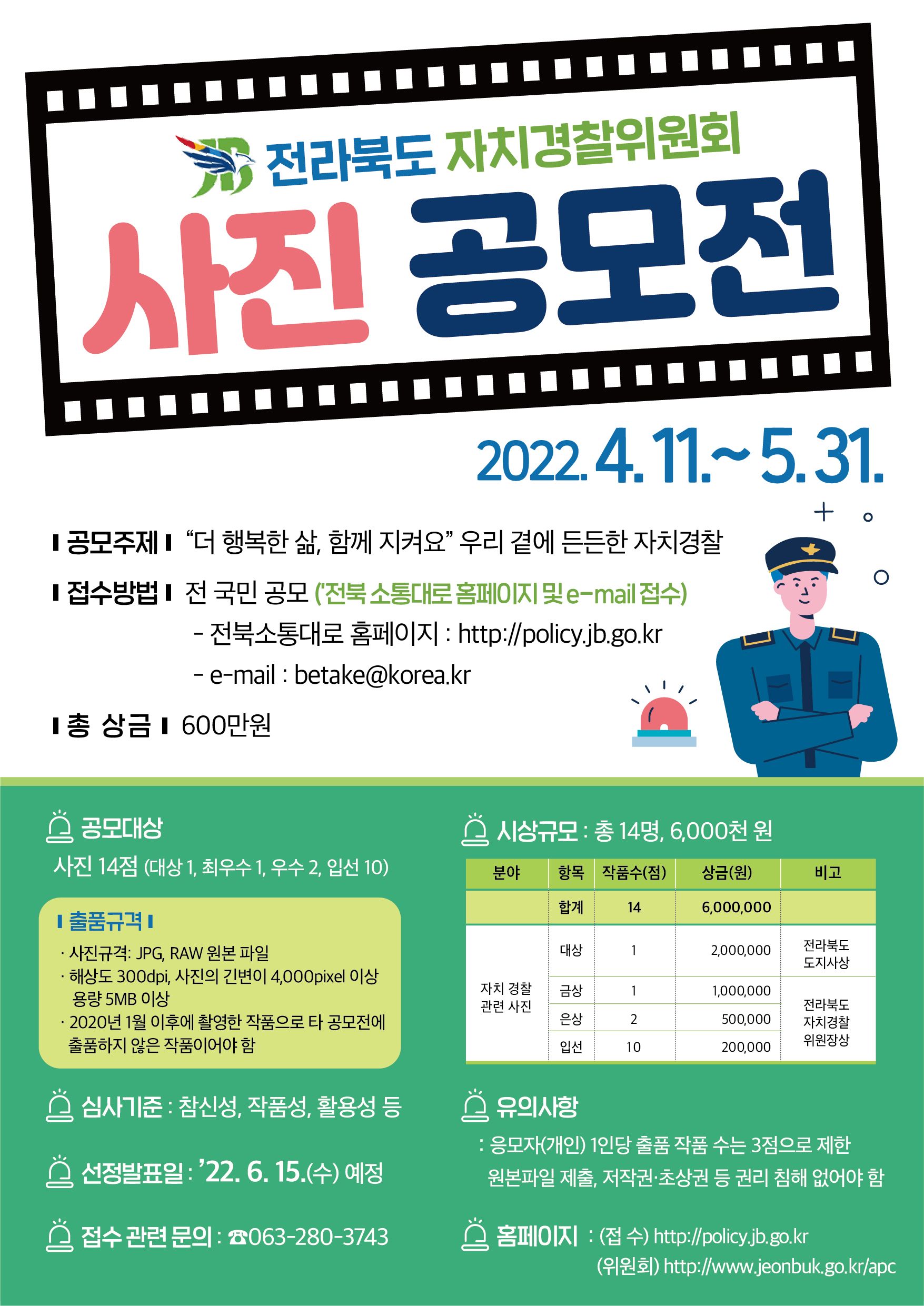 - 당선작 발표 : 전북 자치경찰위원회 및 소통대로 홈페이지 등에 게시