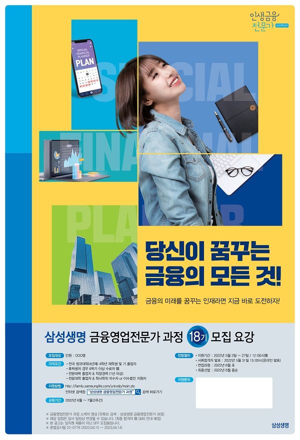 - 대한민국 최고의 기업 삼성생명에서 주관하는 대외활동입니다. 삼성생명 금융영업전문가 과정은 취업을 앞둔 대학생들의 희망찬