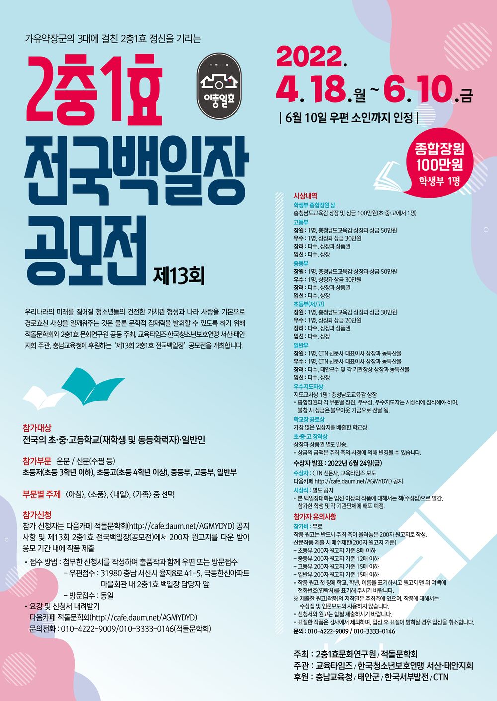 우리나라의 미래를 짊어질 청소년들의 건전한 가치관 형성과 나라 사랑을 기본으로 경로효친 사상을 일깨워주는 것은 물론 문학적 잠재력을 발휘 할 수 있도록 하기 위해 적돌문학회와 2충1효 문화연구원 공동 주최, 교육타임즈·한국청소년보호연맹 서산·태안지회 주관, 충남교육청 후원하는 '제13회 2충1효 전국백일장'공모전을 개최합니다.