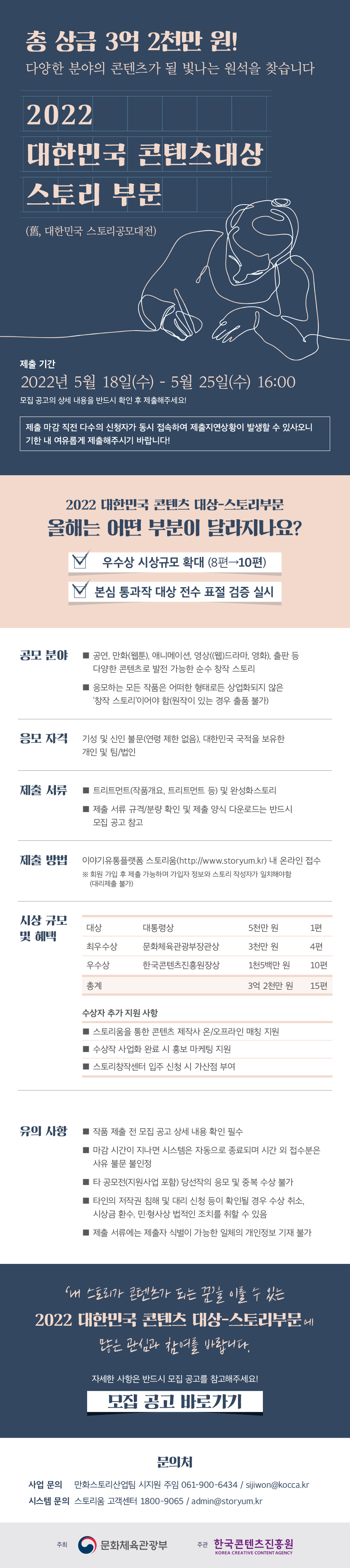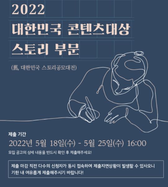‘내 스토리가 콘텐츠가 되는 꿈’을 이룰 수 있는 「2022 대한민국 콘텐츠 대상-스토리 부문」에 많은 관심과 참여 바랍니다.
