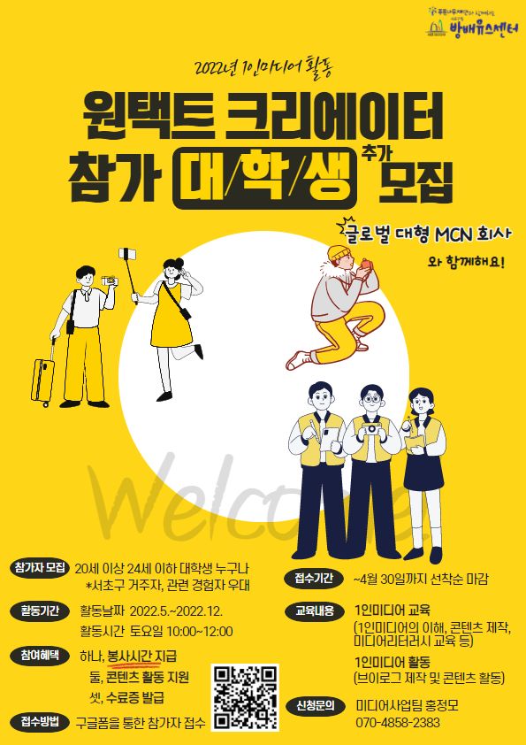 * 활동장소: 방배유스센터 3층 1인미디어실 또는 온라인 화상회의(Zoom)