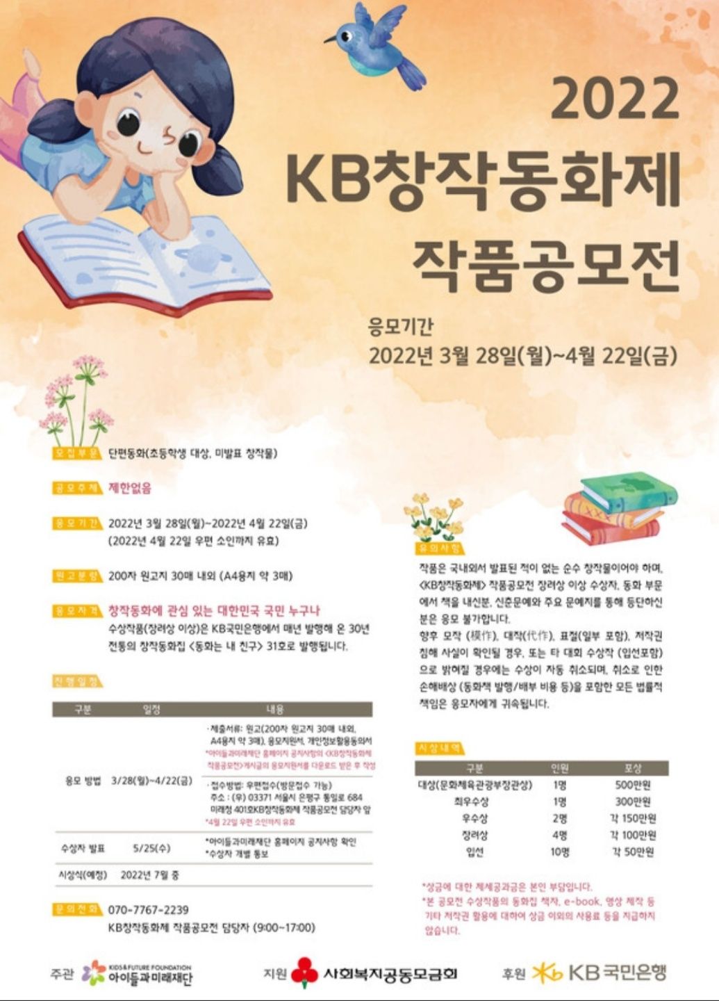 *(우) 03371 서울시 은평구 통일로 684 미래청 401호 KB창작동화제 작품공모전 담당자 앞, 4월 22일 우편 소인까지
