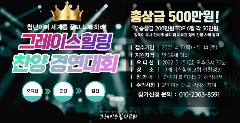 이 시대의 청년들을 살리기 위한 목적으로 만들어진 청년밥집선교교회 '모이다청년카페' 와 그레이스힐링교회에서 주관하는 찬양경연대회로 이 시대의 청년들을 응원하고 세워가자는 취지에서 만들어진 대회입니다.