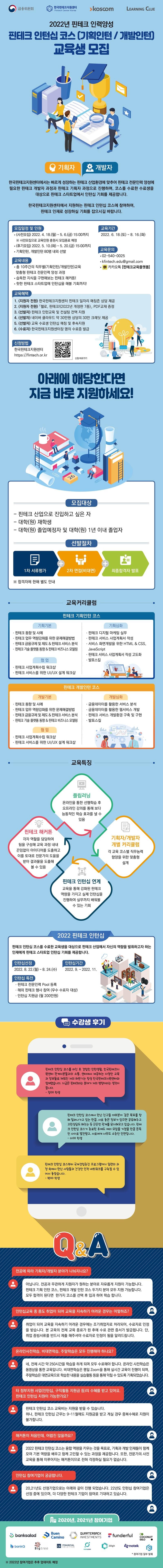 한국핀테크지원센터에서는 빠르게 성장하는 핀테크 산업환경에 맞추어 핀테크 전문인력 양성에 필요한 핀테크 개발자 과정과 핀테크 기획자 과정으로 진행하며, 코스를 수료한 수료생을 대상으로 핀테크 스타트업에서 인턴십 기회를 제공합니다.