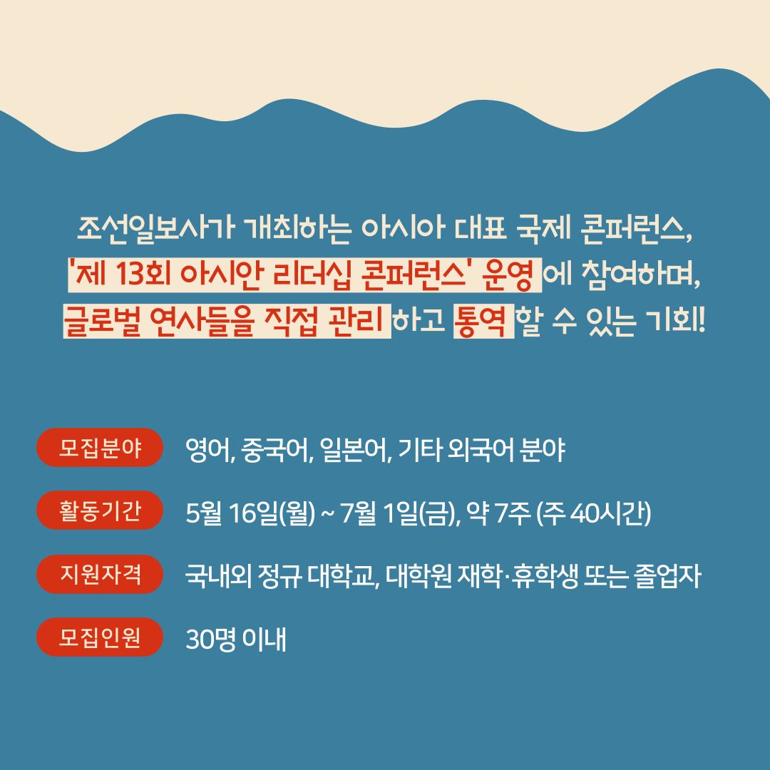 조선일보사가 오는 6월 29~30일 개최하는 '제13회 아시안리더십콘퍼런스(ALC)'에서 활동할 외국어 특기자 인턴을 모집합니다. ALC 인턴들은 조선일보 기자들의 콘퍼런스 운영을 지원하며 초청 연사들을 관리하고 통역하는 업무를 맡 게 됩니다. 조선일보사 홈페이지의 인재 채용 코너에서 지원하면 됩니다.