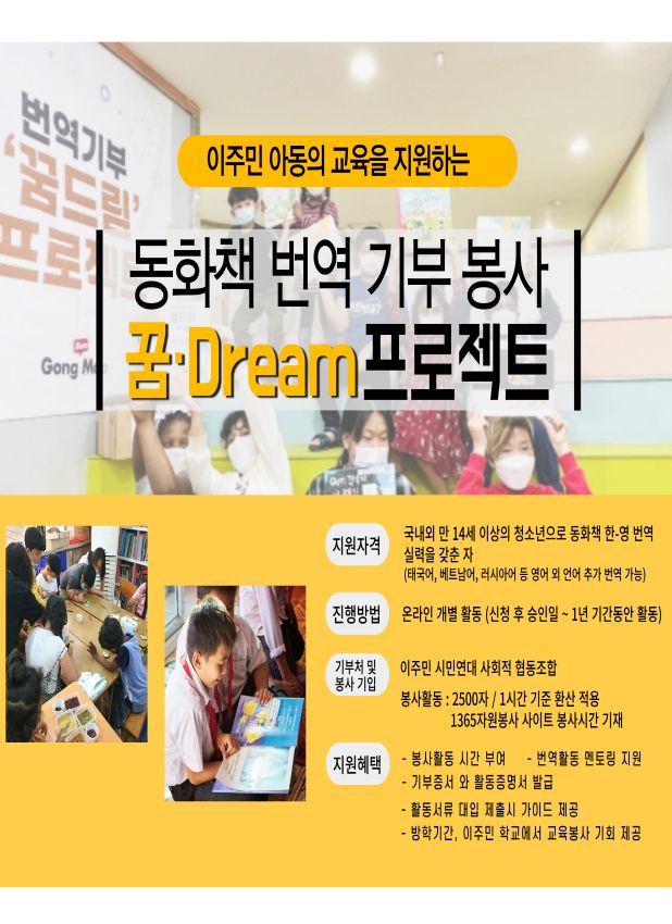 꿈드림 프로젝트는 이주민 아동들에게 줄 동화책을 번역 기부하는 활동입니다.