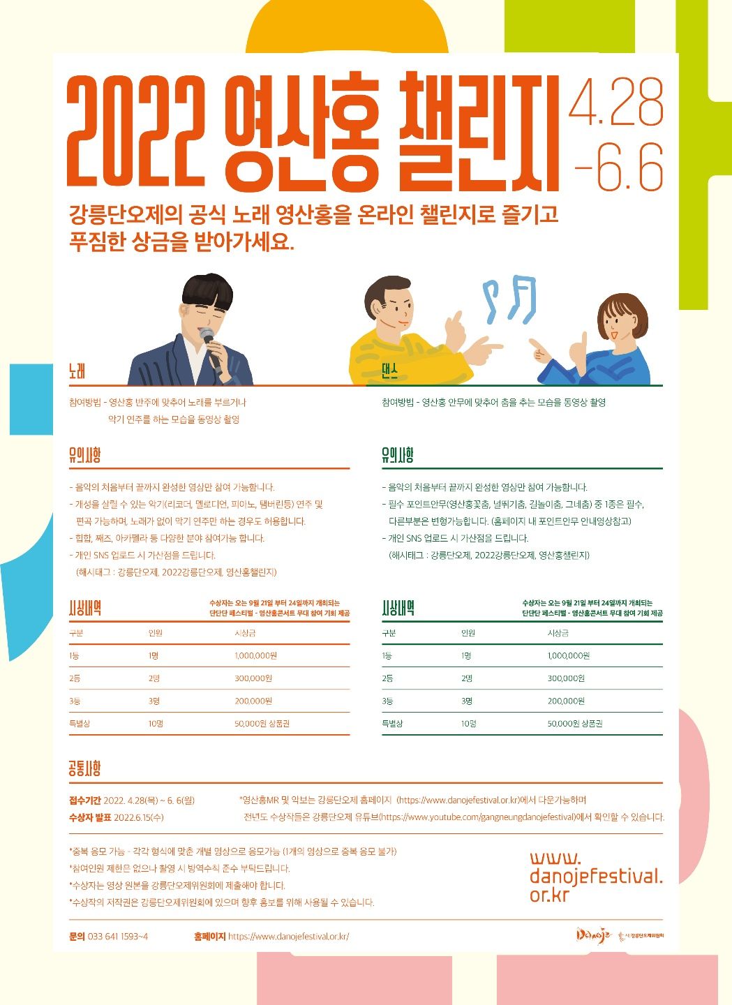 *영산홍 MR 및 악보는 강릉단오제 홈페이지 (https://www.danojefestival.or.kr/)에서 다운가능하며, 전년도 수상작들은 강릉단오제 유튜브 (https://www.youtube.com/gangneungdanojefestival) 에서 확인할 수 있습니다.