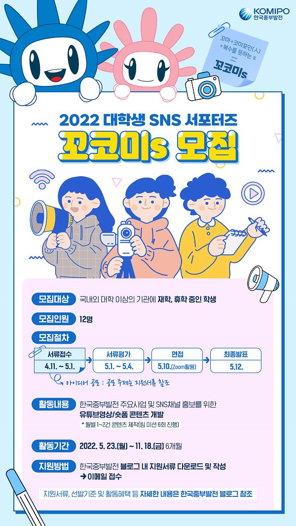 한국중부발전 2022 대학생 SNS 서포터즈 ‘꼬코미s' 모집 (04.11~05.01)