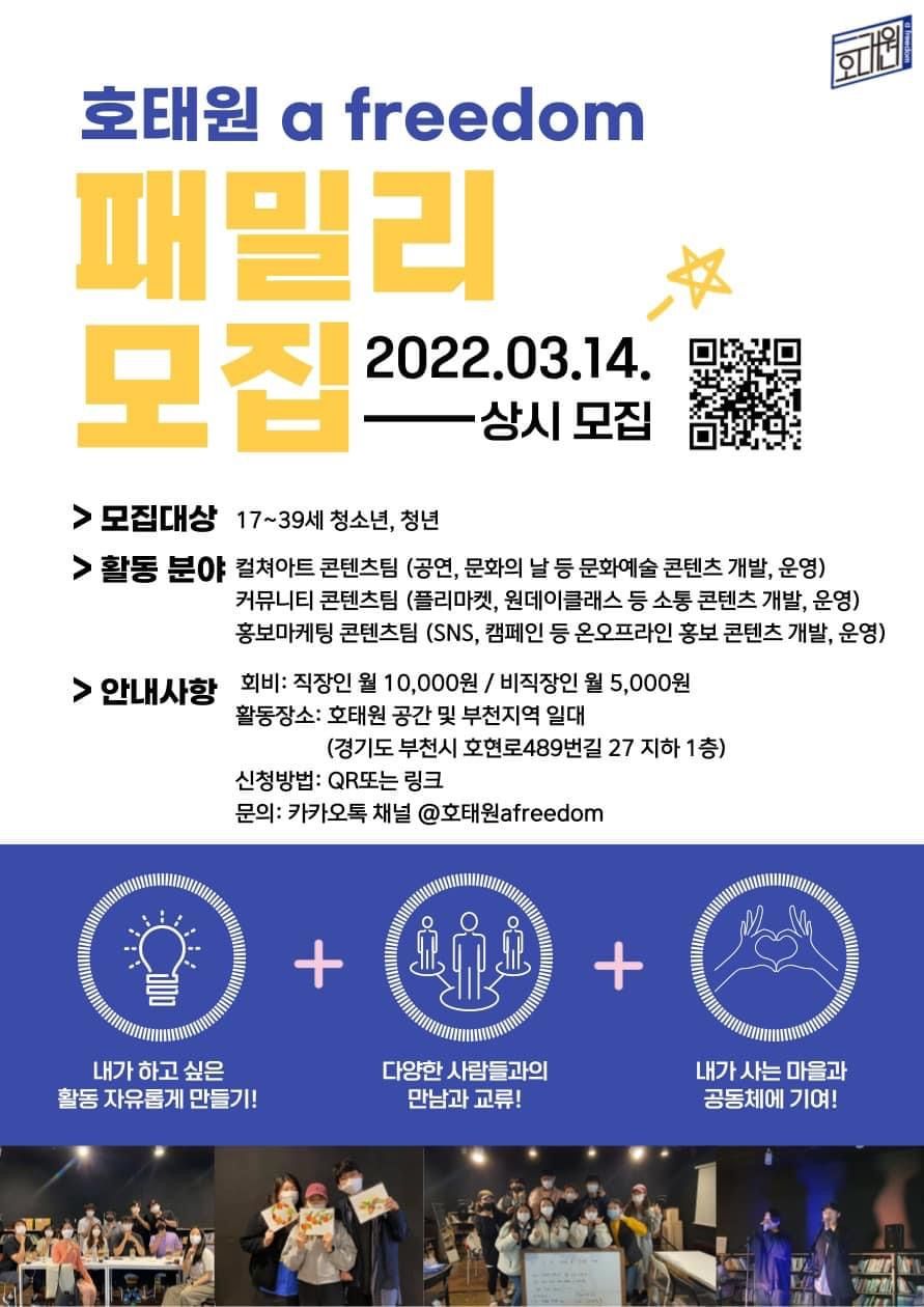 #호태원afreedom #호태원 #부천시 #부천 #소사 #청년단체 #청년활동 #청년공동체 #청년 #청소년 #누구나 #모여라 #문화 #예술 #여가 #놀이 #소통 #마을공동체 #문화여가활동 #공간 #패밀리 #서포터즈 #모집