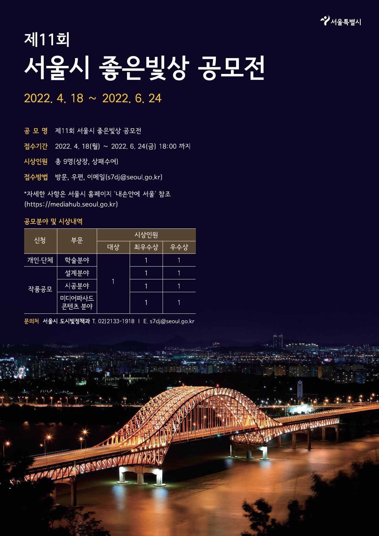 - 우편(이메일) 및 방문 접수 : 서울특별시 도시빛정책과(서울특별시청 서소문제2청사 11층), 이메일(s7dj@seoul.go.kr)