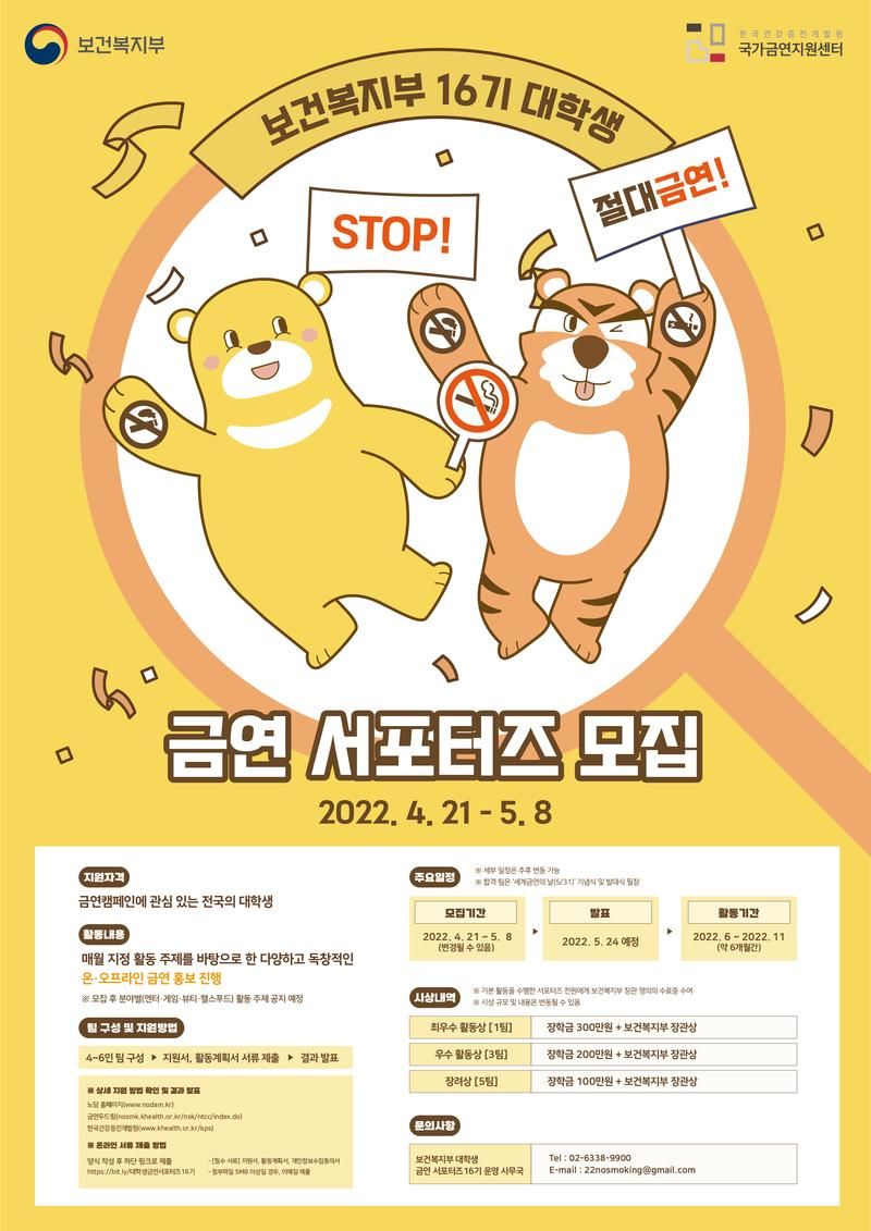 담배 없는 건강한 대한민국 만들기에 앞장설 보건복지부 대학생 금연서포터즈 16기를 모집합니다!