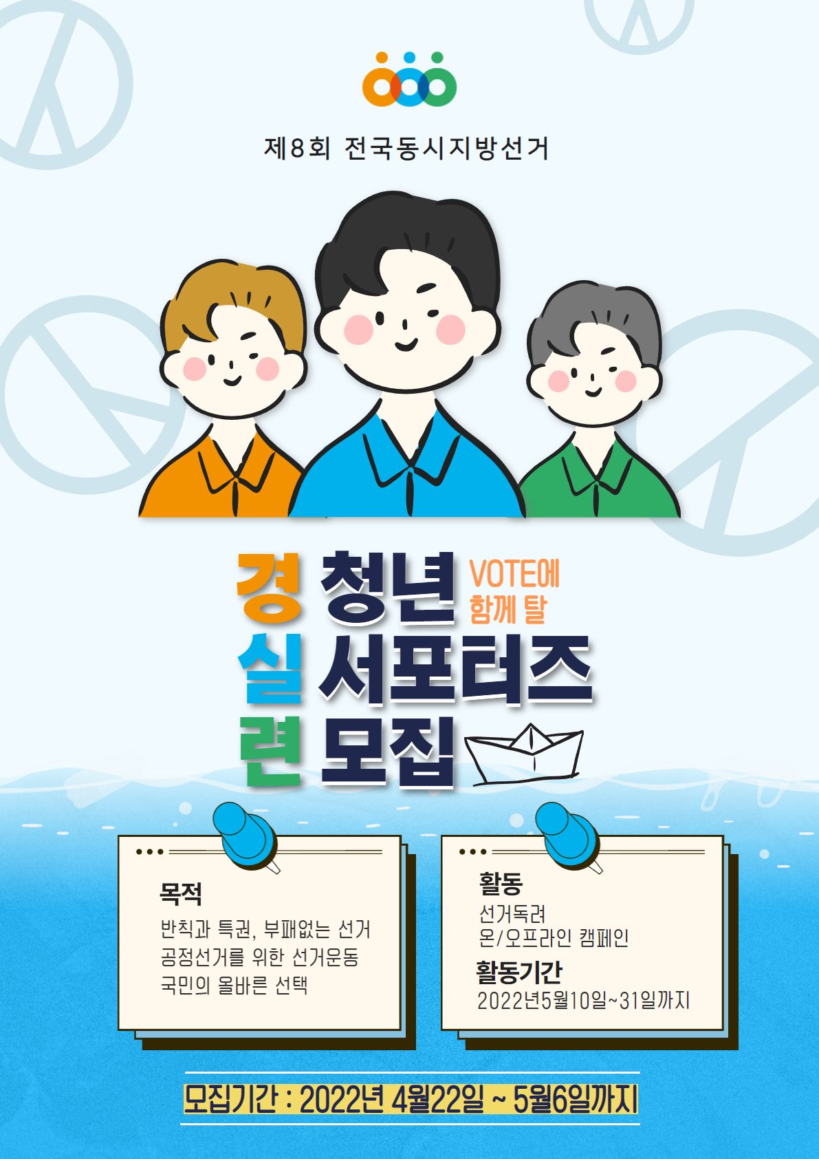 경실련은 2022년 제8회 전국동시지방선거가 공정하게 진행될 수 있도록 감시하고 선거를 홍보하는 등 선거 캠페인을 진행할 예정입니다. 선거 캠페인을 함께 할 청년 서포터즈를 모집하오니 많은 관심 부탁드립니다.
