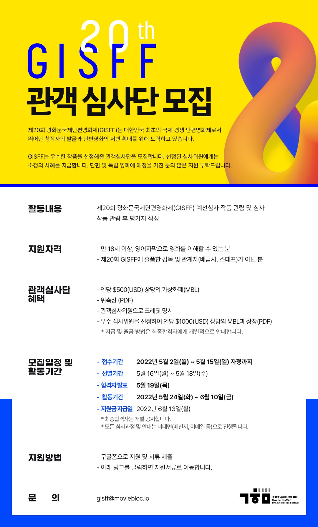 5월 24일 부터 진행하는 제 20회 광화문국제단편영화제(GISFF)는 우수한 작품을 선정해줄 관객 심사단을 모집합니다. 단편 및 독립 영화에 애정을 가진 분의 많은 지원 및 홍보 부탁드립니다.