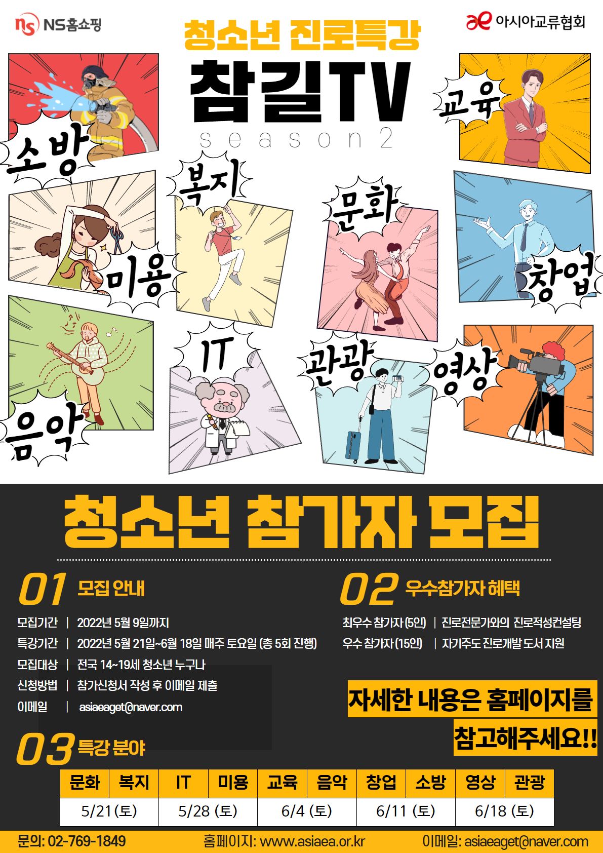 10개 진로분야(문화, 복지, 미용, IT, 교육, 음악, 창업, 소방, 영상, 관광)의 전공 대학생, 직장전문가의 특강을 통해 나만의 진로를 찾아보세요!