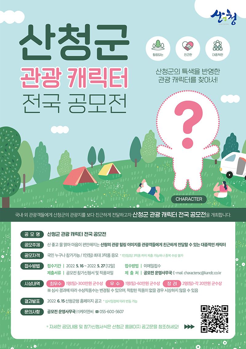 산청군의 특색을 반영한 관광 캐릭터를 찾아, 국내․외 관광객들에게 산청군의 관광지를 보다 친근하게 전달하고자 「산청군 관광 캐릭터 전국 공모전」을 개최하오니 관심 있는 여러분들의 많은 참여 바랍니다.