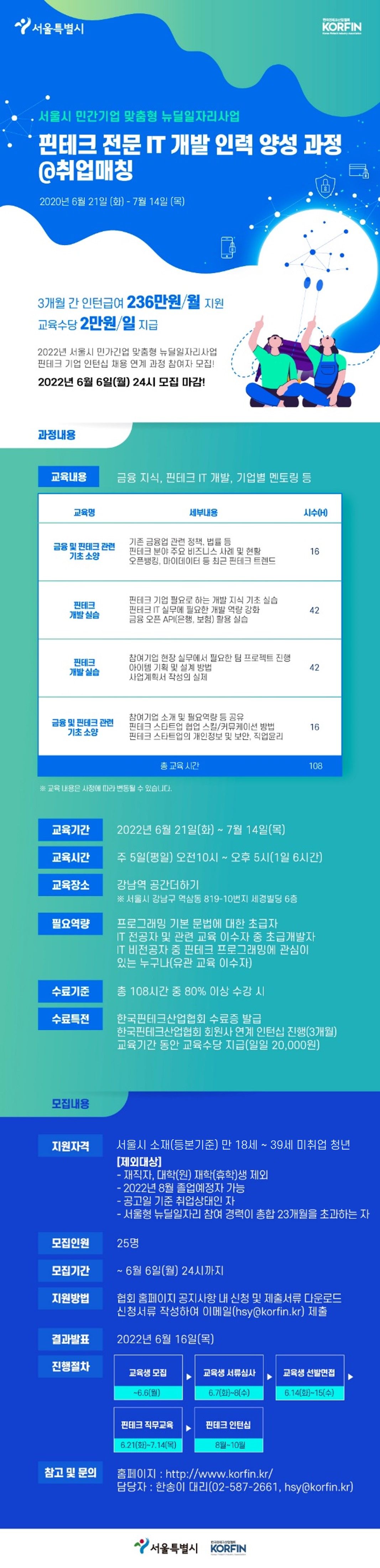 2022년 서울시 뉴딜일자리 사업으로 핀테크 교육을 아래와 같이 진행하게 되어 안내드리오니 많은 참여 바랍니다.