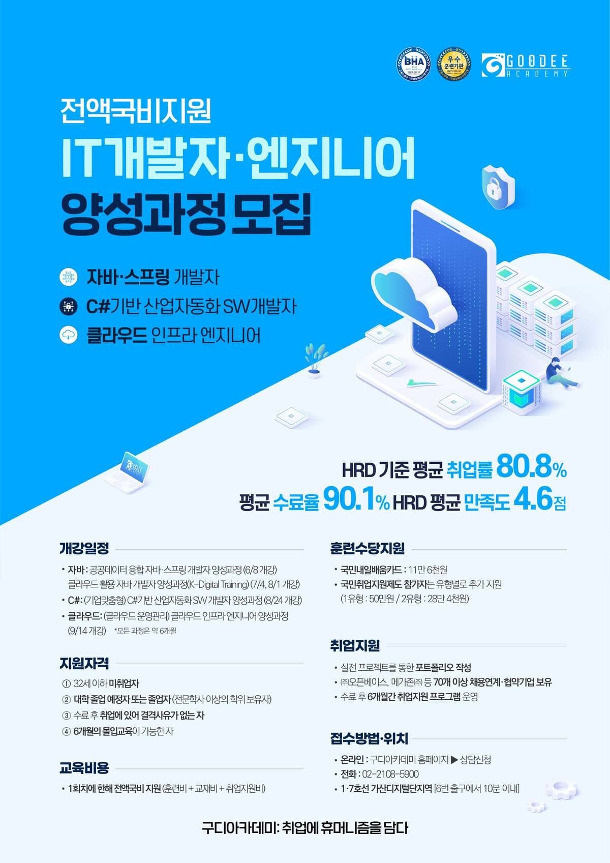 - 취업률 80.8% / 수료율 90% / HRD평균만족도 4.6점