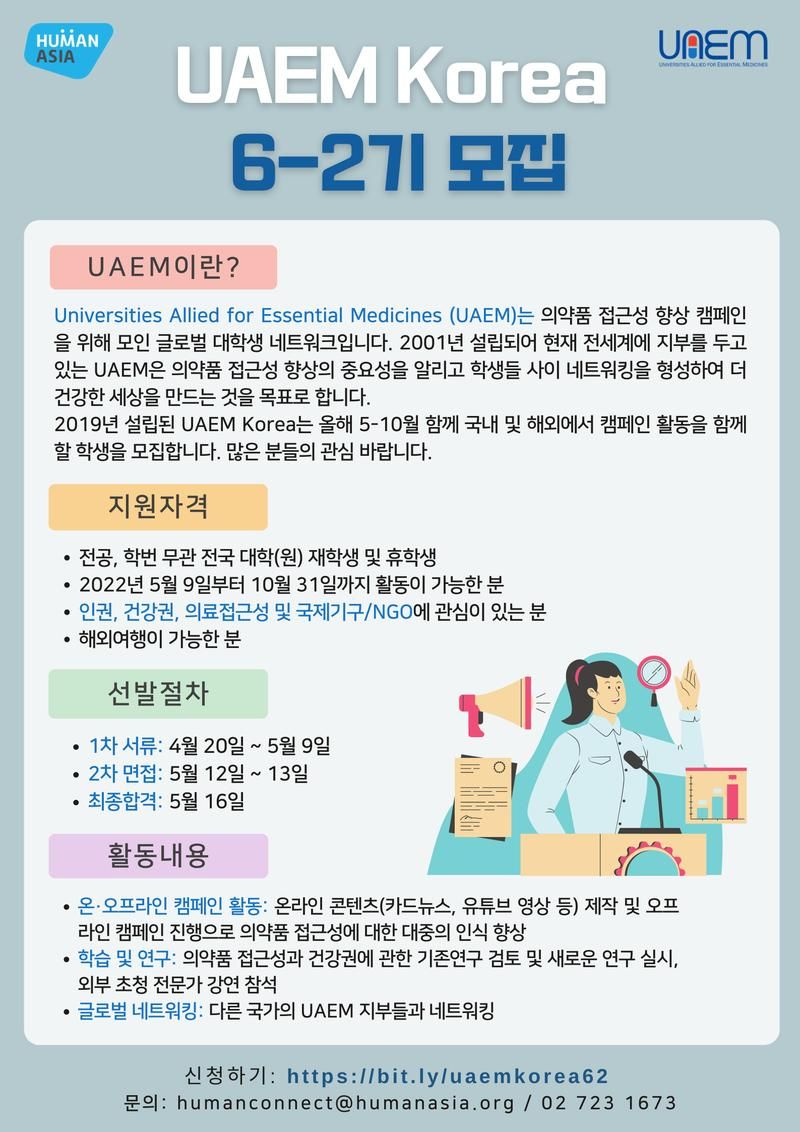 2019년 설립된 UAEM Korea는 올해 5 ~ 10월 함께 국내 및 해외에서 캠페인 활동을 함께 할 학생을 모집합니다.