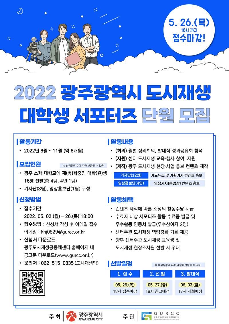 (사)광주광역시도시재생공동체센터는 광주광역시 대학생을 대상으로 도시재생사업에 대한 이해를 도모하고 광주다운 도시재생의 필요성과 현황을 홍보하기 위하여 「2022 광주광역시 도시재생 대학생 서포터즈」를 다음과 같이 모집하오니 많은 관심과 참여바랍니다.