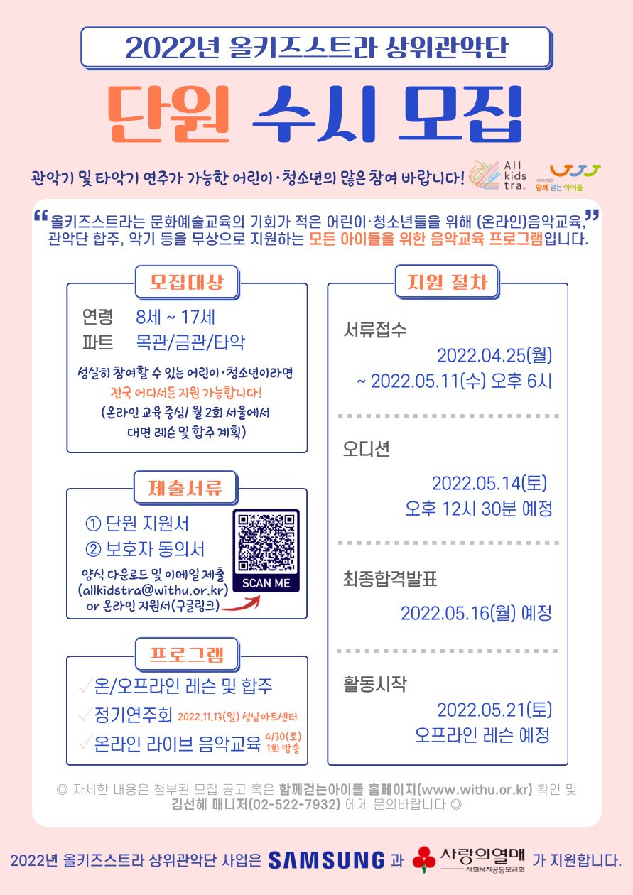 2022년 올키즈스트라 상위관악단 단원을 수시 모집합니다.
