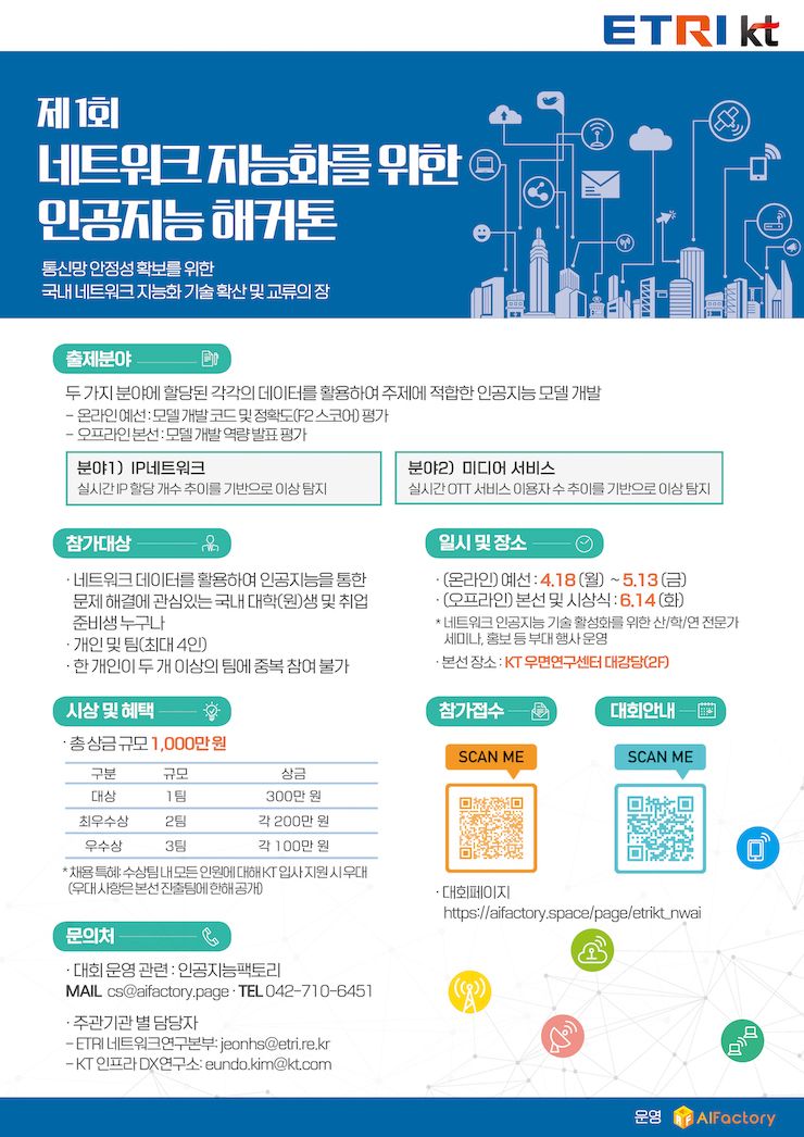 - 본선 오프라인 발표일 및 시상식 : 6/14 (화) *네트워크 인공지능 기술 활성화를 위한 산/학/연 전문가 세미나, 홍보 등 부대 행사 운영