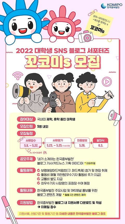 한국중부발전 2022 대학생 SNS 블로그 서포터즈 ‘꼬코미s' 모집 (05.09~05.22)