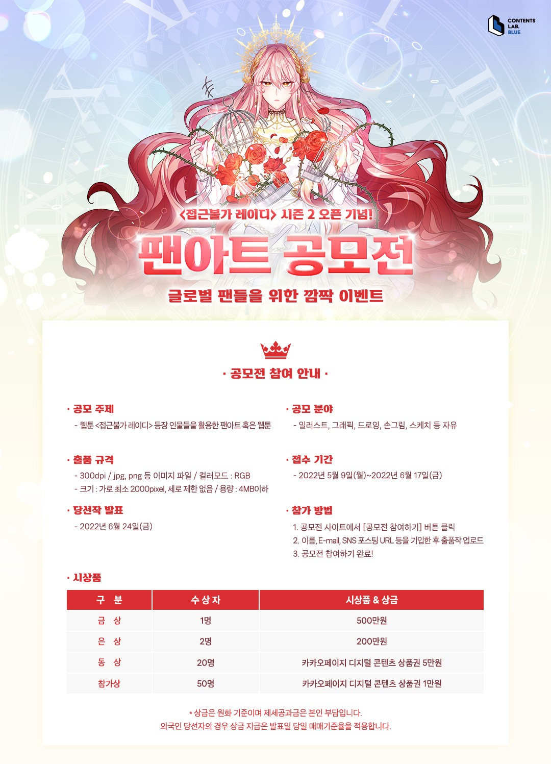 - 웹툰<접근불가 레이디> 시즌 2 오픈 기념으로 마련된 글로벌 팬아트 공모전입니다.