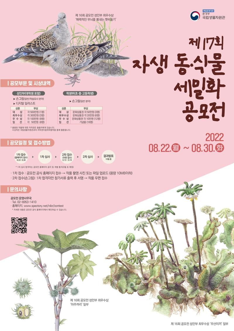 국립생물자원관에서는 우리나라 생물의 아름다움과 가치를 알리기 위해 "제17회 자생 동·식물 세밀화 공모전"을 개최합니다.