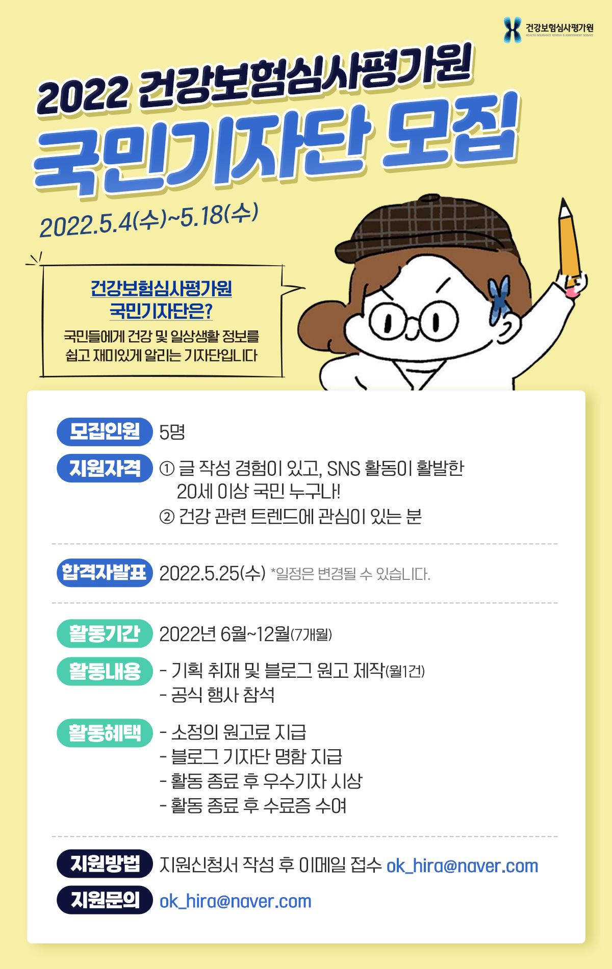 [건강보험심사평가원] 2022 건강보험심사평가원 국민기자단 모집 (~5/18)
