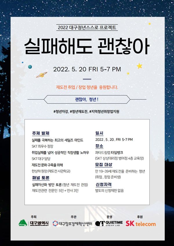 삶의 다양한 환경에서 실패경험이 있는 청년들이 재취업과 재창업에 다시 과감한 도전을 할 수 있도록 재도전전문가와 가장 실패 상황에 많이 접하는 직군중 한분야인 세일즈 마스터가 함께하는 재도전지원 프로그램입니다. 해당 프로그램은 대구광역시가 주최하고 대구창조경제혁신센터가 주관하며 2022 대구청년 스스로프로젝트 공모지원 사업으로 콰타드림랩이 기획하여 운영하는 프로그램으로 5월 1차 포럼, 7월 1박2일 캠프, 9월 괜찮아 축제 1회로 이어집니다.