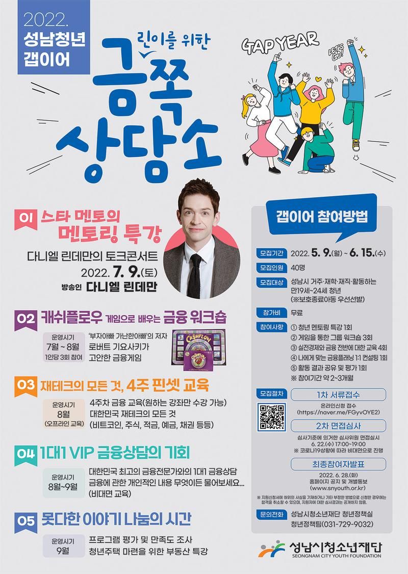 (재)성남시청소년재단에서는 이직, 전직, 전공의 전환과 갭이어 등을 고려하는 청년들이 현명하고 지혜로운 금융 생활을 영위할 수 있도록 도움을 주고자 합니다. 이에 관심 있는 청년 여러분의 많은 관심과 참여 바랍니다.