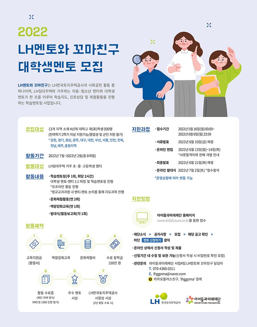 [LH한국토지주택공사] 2022 LH멘토와 꼬마친구 대학생멘토 모집 (~6/6)