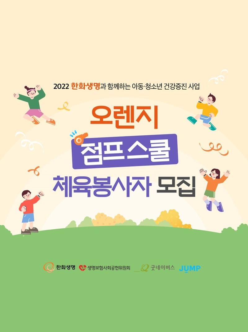이 세상 모든 아이들을 위한 아동·청소년 건강증진 사업 ‘오렌지 점프 스쿨’은 생명보험사회공헌위원회와 한화생명, 굿네이버스, 사단법인 점프가 지역사회 아동·청소년에게 체육활동의 기회를 제공하고, 체육전공 대학(원)생을 포용인재로 육성하는 교육나눔(멘토링) 프로그램입니다.