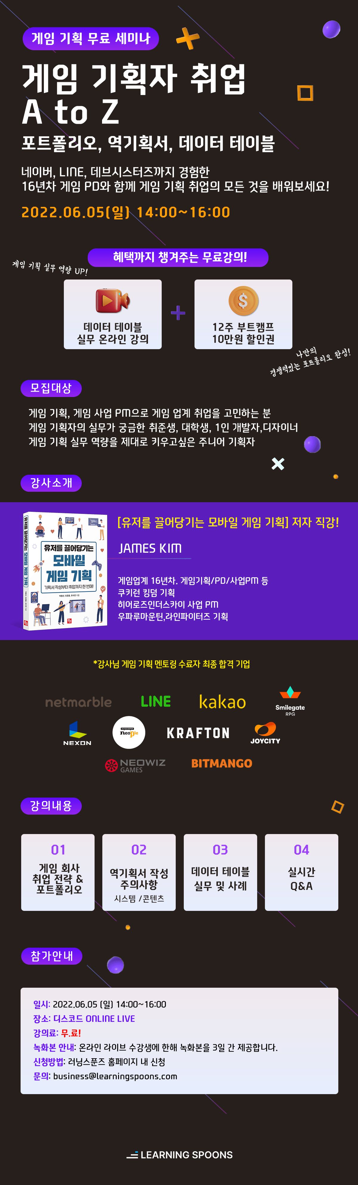 게임업계 (게임 기획, 사업 PM)등에 취업을 고민하시는 분들부터, 게임 제작 과정의 탄탄한 기획 과정 실무가 궁금하신 분들이라면, 이 무료 강의 절대 놓치지 마세요:)