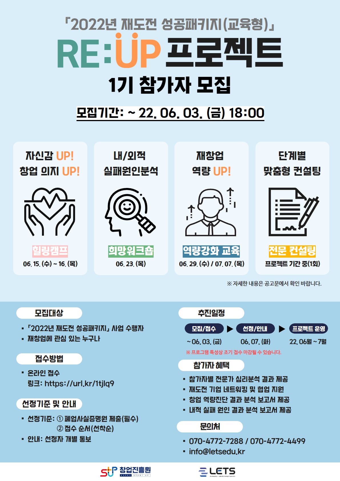 (예비)재창업자의 성공적인 심리회복과 재창업 역량 향상을 위한 「2022 재도전 성공패키지(교육형)」 RE:UP 프로젝트 참가자를 모집합니다.