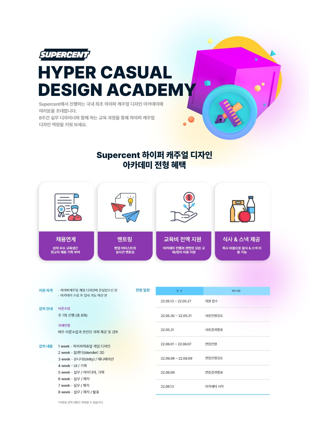 슈퍼센트에서 진행하는 국내 최초 하이퍼 캐주얼 디자인 아카데미에 여러분을 초대합니다.