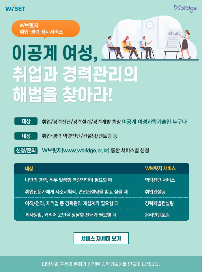 [WISET] 이공계 맞춤형 취업/경력개발 컨설팅과 멘토링을 받아보세요! (무료상시)
