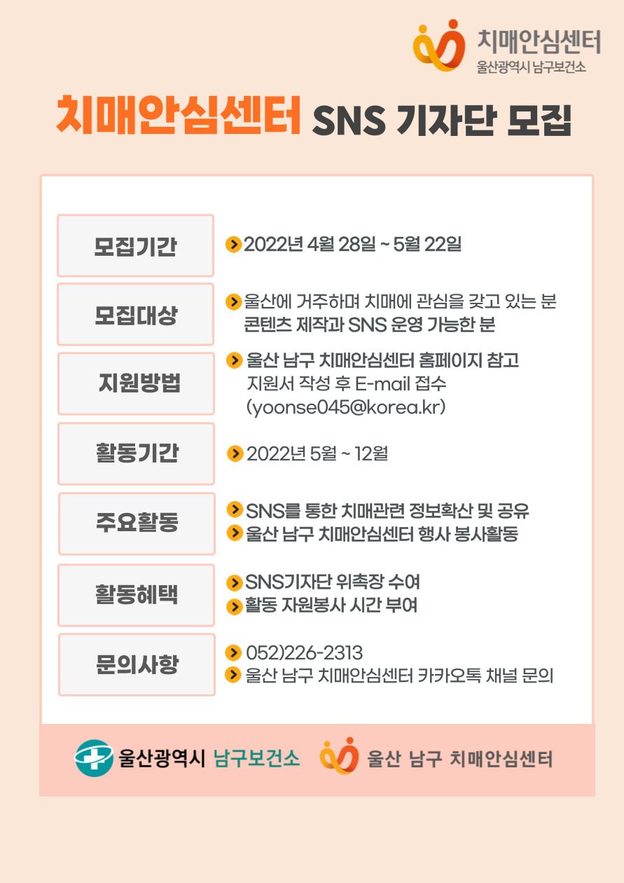 울산 남구 치매안심센터에서 2022년 SNS 기자단을 모집합니다!