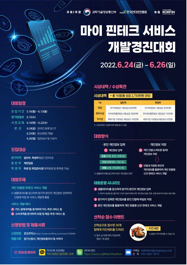 o 대회내용 : 참가자 본인의 개인정보(금융, 생활, 건강 등)를 직접입력하여 개인 단말에 저장 후 신규 핀테크 서비스 개발