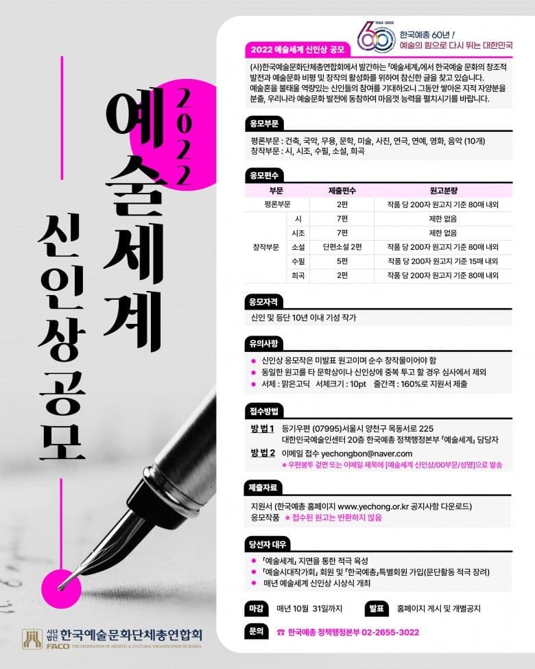 (사)한국예술문화단체총연합회에서 발간하는 「예술세계」에서 한국예술 문화의 창조적 발전과 예술문화 비평 및 창작의 활성화를 위하여 참신한 글을 찾고 있습니다. 예술혼을 불태울 역량있는 신인들의 참여를 기대하오니 그동안 쌓아온 지적 자양분을 분출, 우리나라 예술문화 발전에 동참하여 마음껏 능력을 펼치시기를 바랍니다.