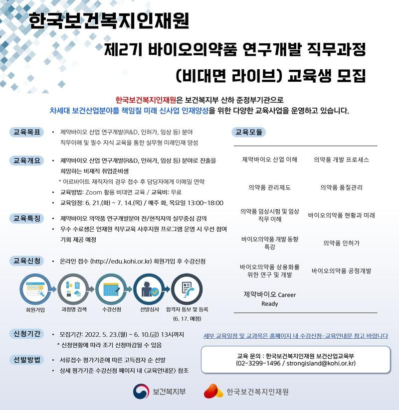 22년 제2기 바이오의약품 연구개발 직무과정 교육생 모집 안내 드립니다.