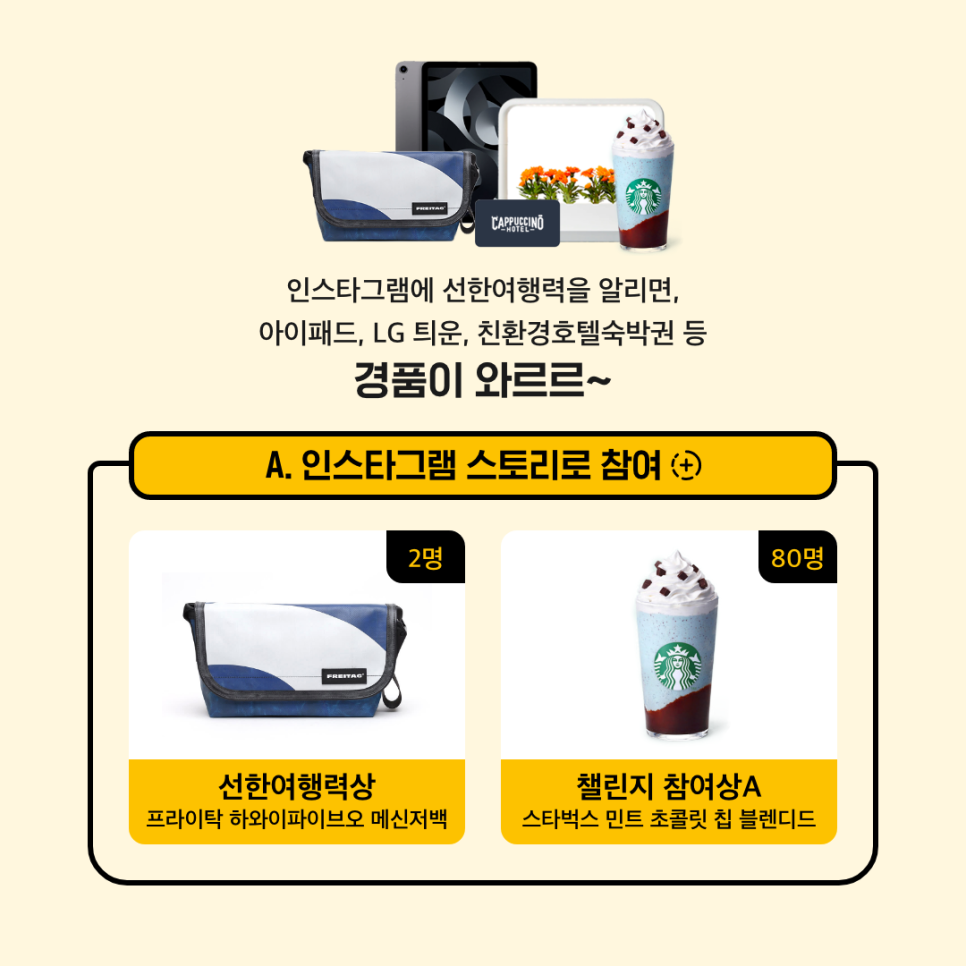 - 아이패드, 프라이탁, LG트운, 카푸치노호텔 숙박권, 스타벅스 쿠폰 등