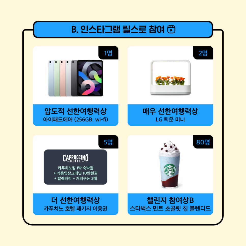 (선한여행력상, 챌린지참여상 A,B는 랜덤 추첨, 그 외 수상자는 영상콘텐츠의 반응도(좋아요, 댓글 수)+내부심사를 통해 선정됩니다.)