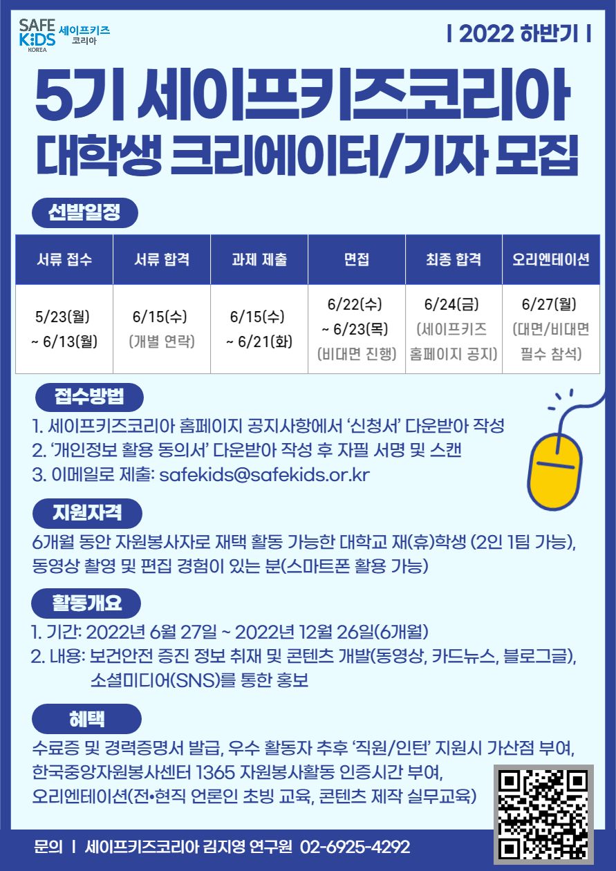 5. 최종합격자 발표: 2022년 6월 24일 (금) (세이프키즈 홈페이지 공지)