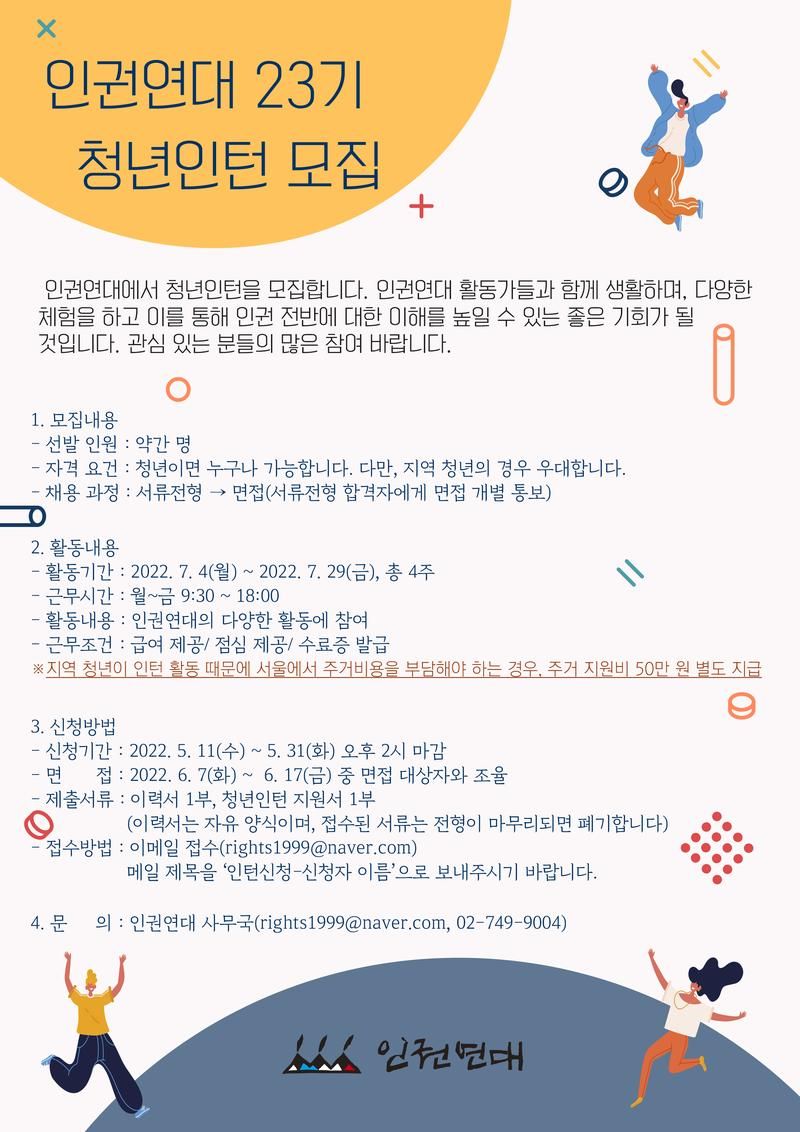 인권연대에서 청년인턴을 모집합니다. 인권연대 활동가들과 함께 생활하며, 다양한 체험을 하고 이를 통해 인권 전반에 대한 이해를 높일 수 있는 좋은 기회가 될 것입니다. 관심 있는 분들의 많은 참여 바랍니다. 자세한 내용은 포스터를 통해 확인할 수 있습니다 :)