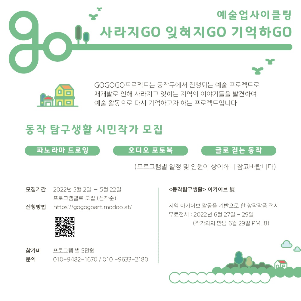 고고고 프로젝트는 지역문화콘텐츠 특성화 사업의 일환으로 재개발로 인해 사라지고 잊히는 지역의 이야기들을 발견하여 예술 활동으로 다시 기억하고자 하는 프로젝트 입니다.